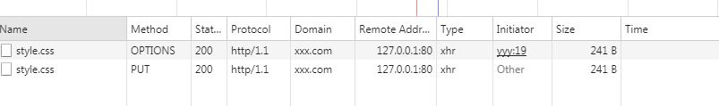 从上图中可以看到,浏览器发送了两个AJAX请求,第一个请求可以成为’预检‘请求,请求方法是OPTIONS,是浏览器自动发的。浏览器询问目标服务器是否允许PUT请求,如果允许则会发第二次真正地PUT请求。